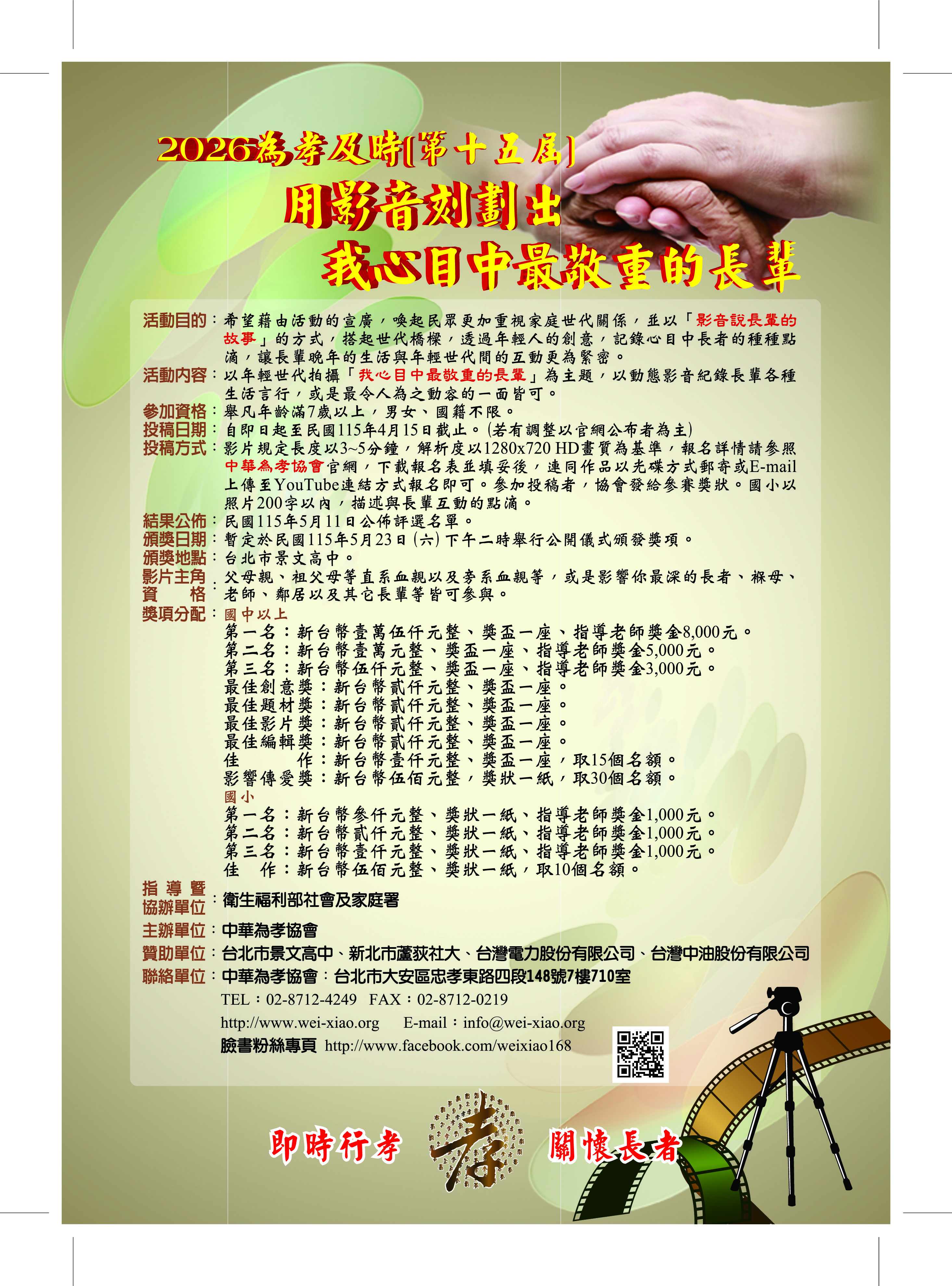 2026為孝及時 [第十五屆]用影音刻劃出我心目中最敬重的長輩!五位評審名單